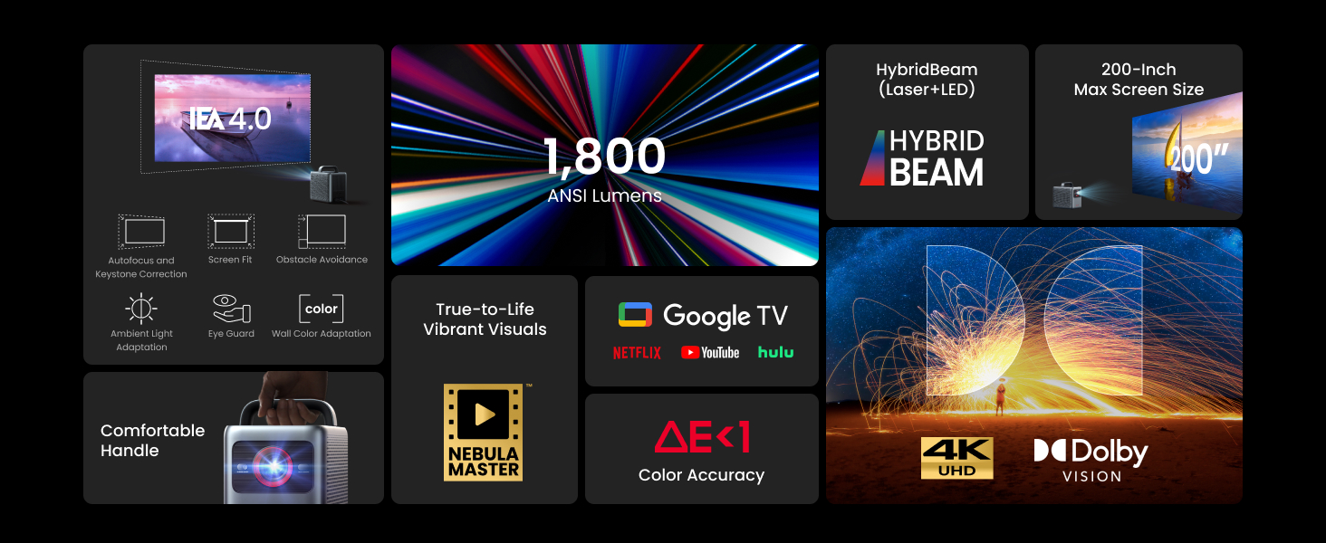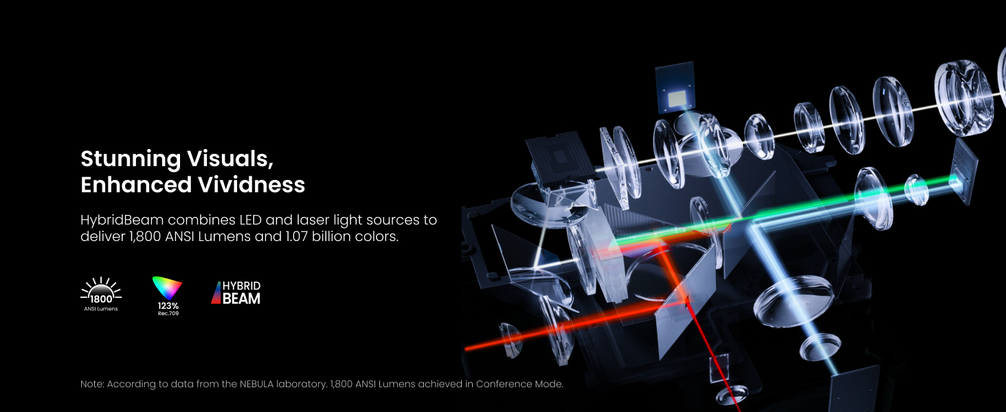 - HybridBeam Technology for High Brightness: Our all-new HybridBeam technology combines LED and laser light sources to deliver 1,800 ANSI Lumens of brightness and 1.07 billion rich colors.