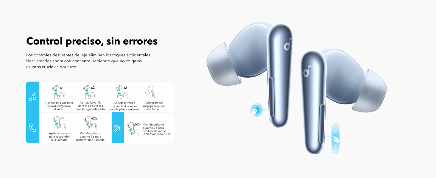 - Controles táctiles fáciles: La pantalla y la barra táctil y te permiten ajustar con precisión los niveles de cancelación de ruido de estos auriculares inalámbricos en cualquier momento con solo deslizar sobre el estuche.