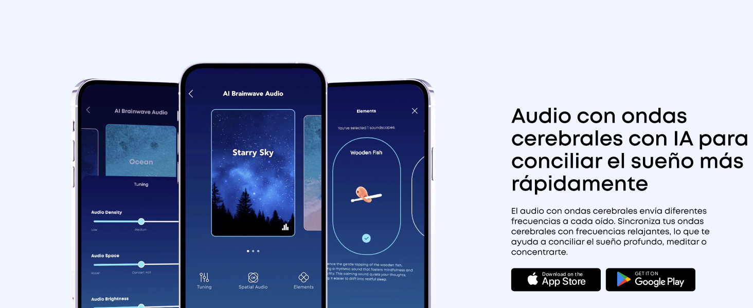 Audio de ondas cerebrales con IA para un sueño reparador: los latidos binaurales envían diferentes frecuencias a cada oído, lo que ayuda a sincronizar tus ondas cerebrales con patrones relajantes para promover la relajación y un sueño reparador.