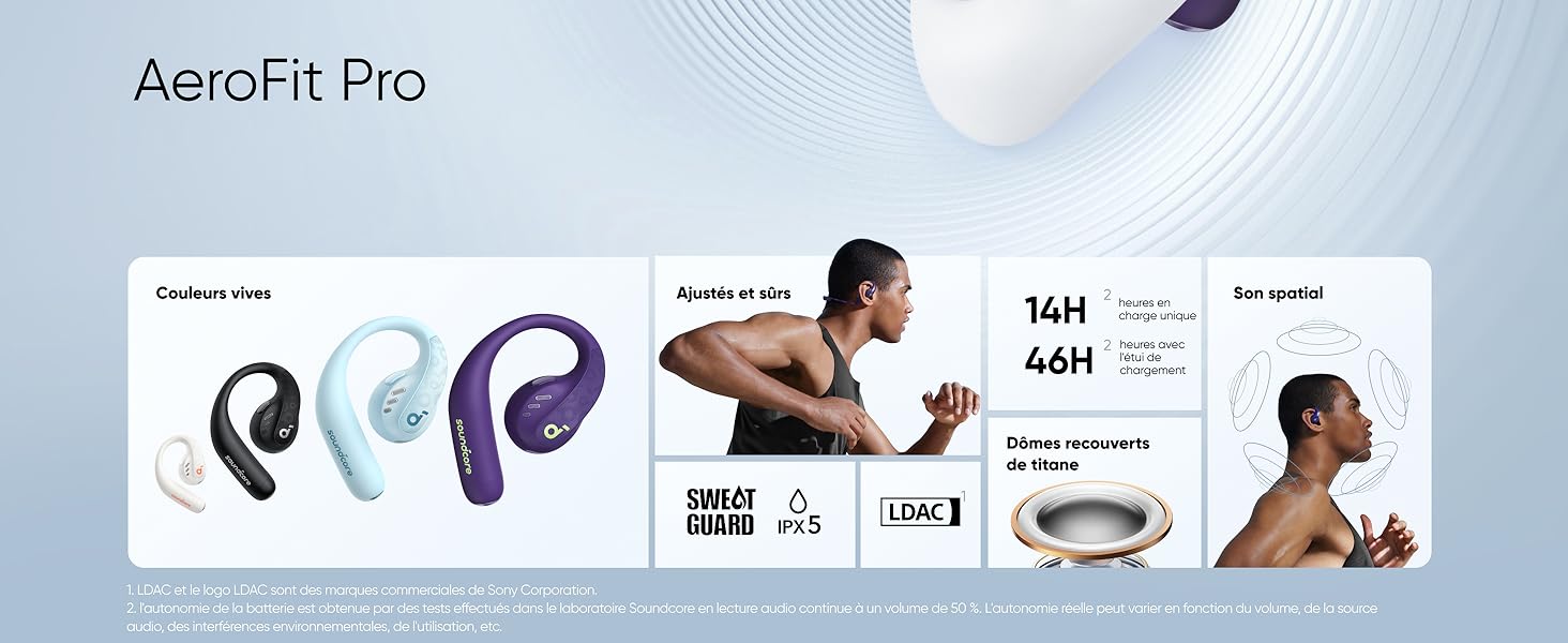 - Écoute ouverte, son sans compromis : les écouteurs ouverts AeroFit Pro sont dotés d'un diaphragme surdimensionné de 16,2 mm revêtu de titane pour des basses robustes et un véritable son spatial. Grâce à la prise en charge de la technologie LDAC, ils offrent une musique haute fidélité et une qualité sonore inattendue.