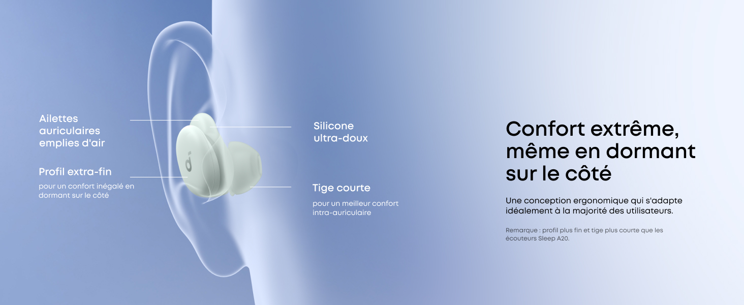 - Confort toute la nuit, même en dormant sur le côté : Dotés d’un silicone ultra-doux, de tiges courtes et d’un design fin et léger, ces écouteurs réduisent la pression pour un confort optimal, même en position latérale.