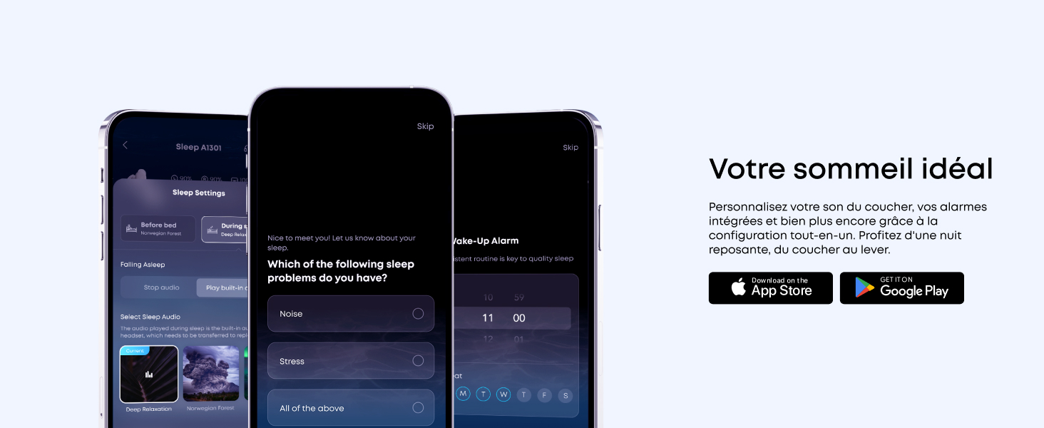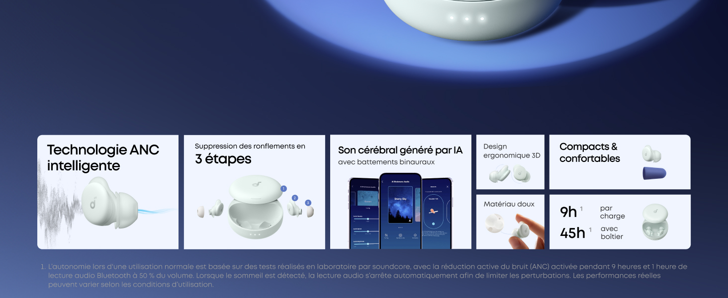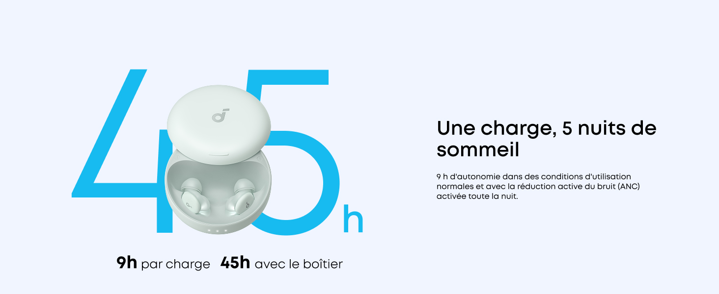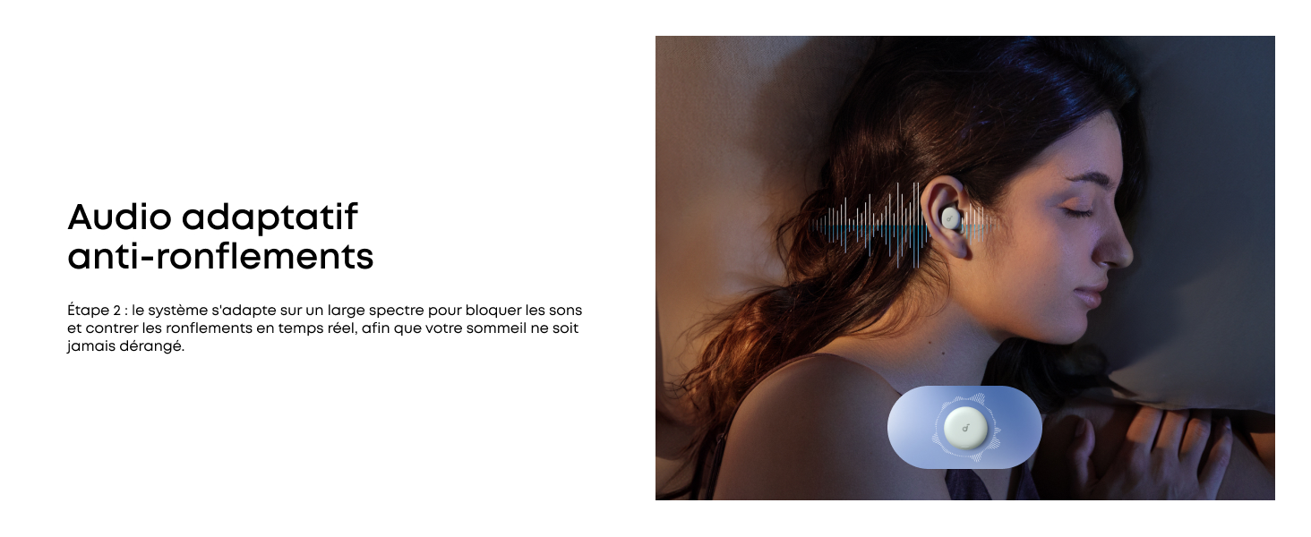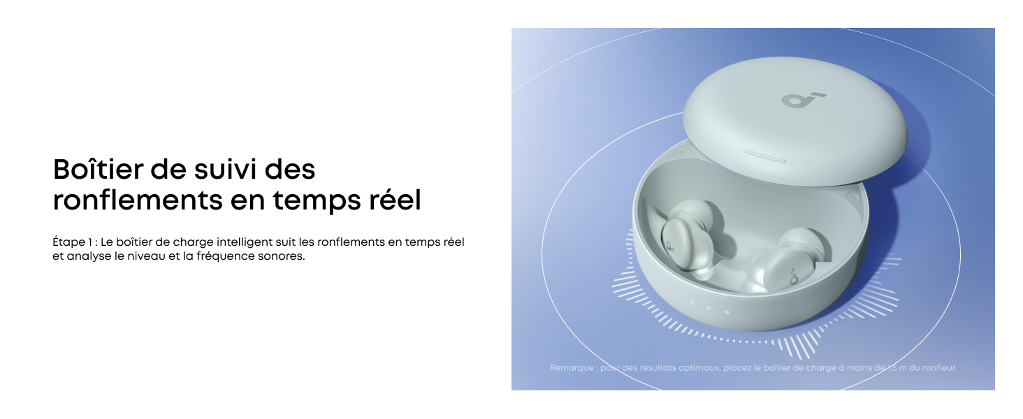 - Système adaptatif de suppression des ronflements : Le boîtier de charge suit et analyse les ronflements, tandis que vos écouteurs optimisent en continu le système de suppression des ronflements, pour que vous puissiez dormir toute la nuit sans être dérangé.