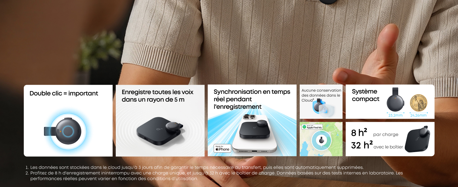 - Respect de la confidentialité : Les fichiers audio ne peuvent pas être transférés au moyen de câbles de données. Les données de l’utilisation sont stockées temporairement dans le Cloud, avant d’être effacées automatiquement pour préserver votre confidentialité.