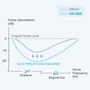 Life Q20 active noise cancelling Bluetooth headphones are engineered with internal and external microphones to cancel out an extended range of low and mid-frequency noises such as airplane engines and traffic.