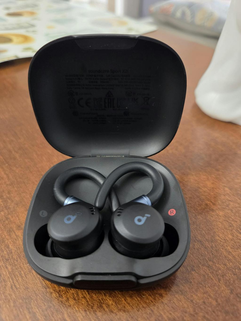 - Look at the L/R logo on the back of the earbuds to ensure that the left and right earbuds are being worn on the correct sides. Rotate the ear hook and turn the earbuds while wearing them and find the most comfortable position.