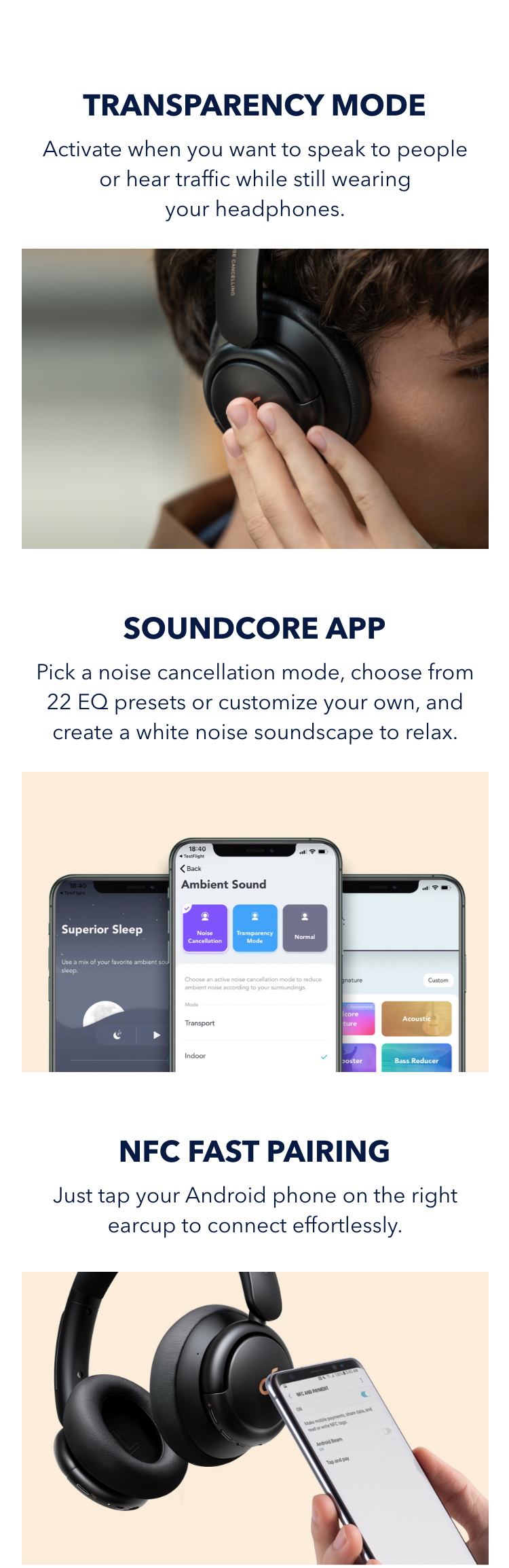 - In the soundcore app, you can select a noise cancellation mode, choose from 22 EQ presets or customize your own, and tailor your own white noise soundscape for when you need to rest.