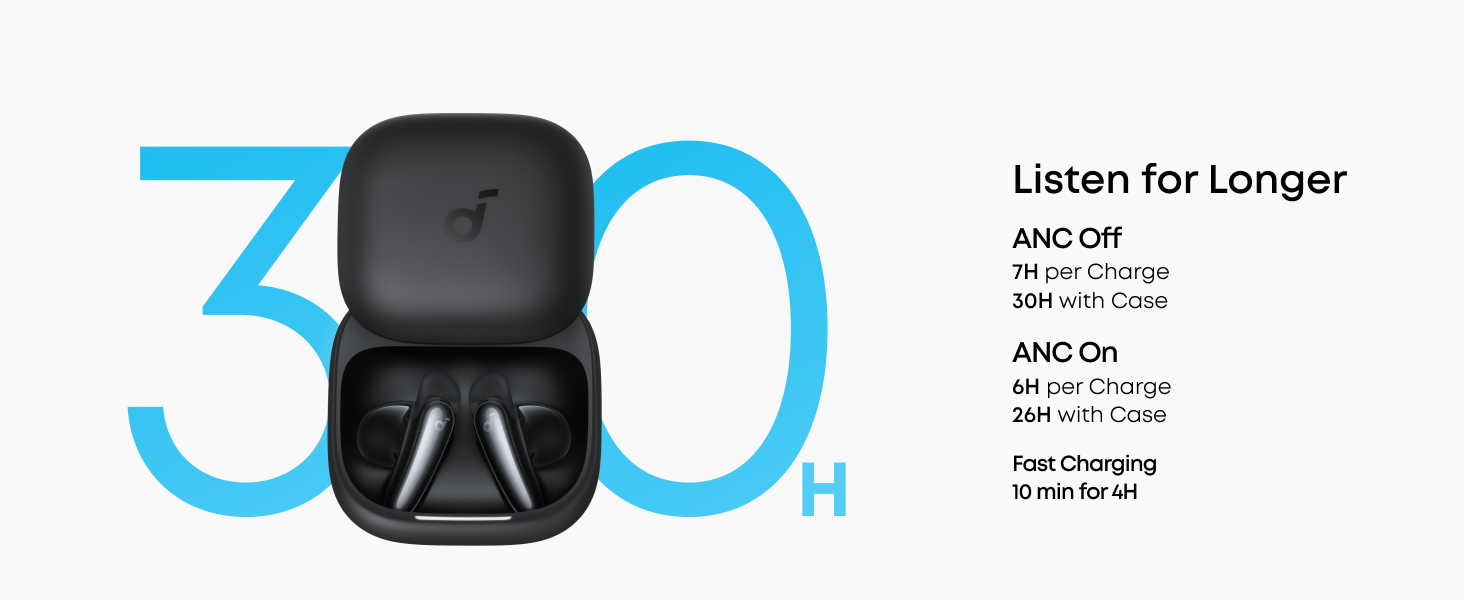 - Long Battery Life: Listen for longer with up to 7 hours of playback on a single charge, and a total of 30 hours with the charging case in standard mode; turn on ANC to block out the noise and enjoy up to 6 hours of listening on a single charge, and up to 26 hours with the charging case.