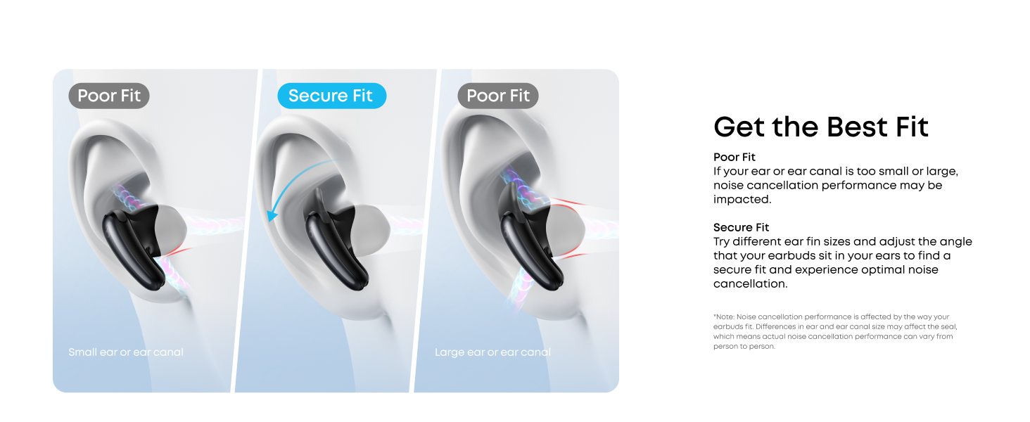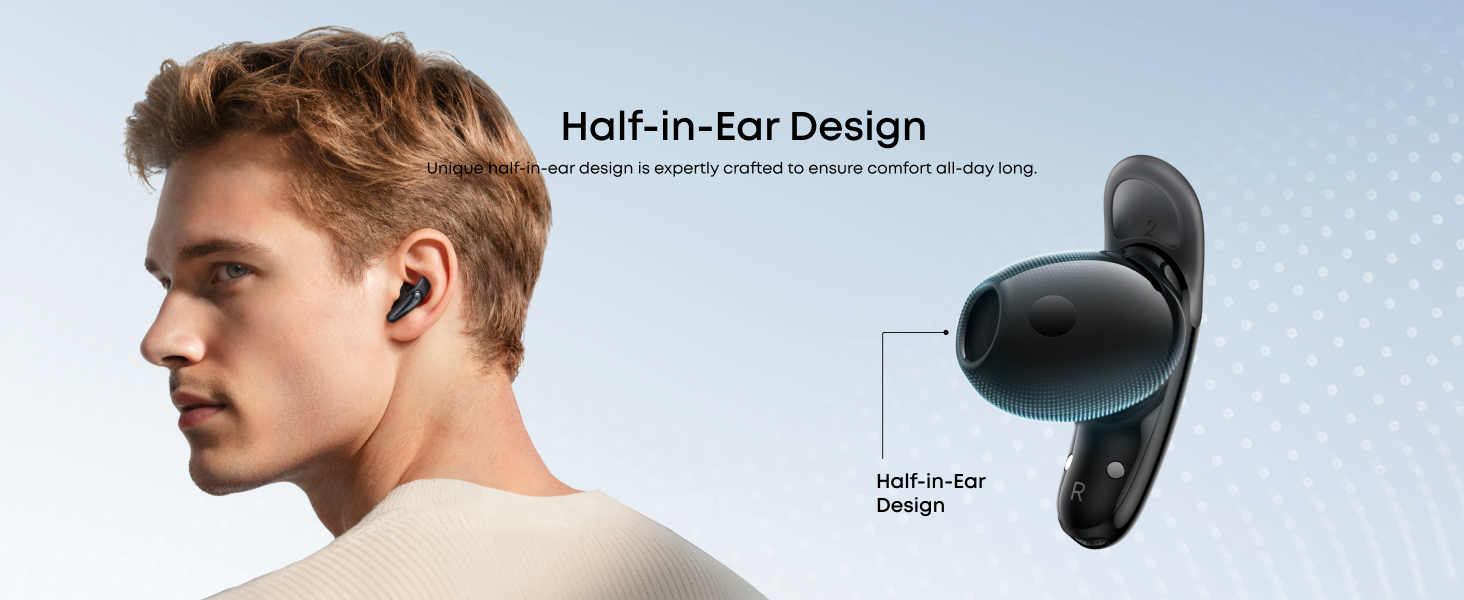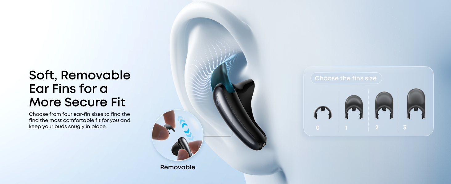 - Half-in-Ear Design with Secure Fins: Enjoy all-day comfort, hear ambient noise to stay connected with the world around you, and get a more secure fit by choosing between four ear-fin sizes.